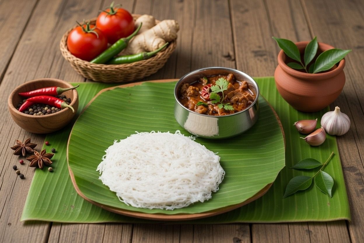 Soft idiyappam served with spicy mutton Chettinad